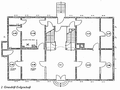 Die Räumlichkeiten sowohl des Erd- als auch des Obergeschosses wurden symmetrisch angelegt und erhalten ihre Verbindung durch eine Enfilade. Im Mittelpunkt des Gebäudes stehen die Raumkompartimente Vestibül - Treppenanlage bzw. Festsaal - Treppenanlage. Insbesondere der Verbindungstrakt, eine zweiläufige, einarmige Treppe mit Zwischenpodest, erfährt eine repräsentative Gestaltung. Er ist durch eine dreifache Bogenstellung zu erreichen, die auf Seitenvorlagen und Pfosten mit quadratischem Grundriß ruht, die Bögen selbst sind mit hölzernen Verschlußsteinen versehen. Das Treppengeländer und die im Treppenraum anzutreffenden Lambris' weisen exakt die gleichen Profile auf, die in noch vorhandenen ursprünglichen Türen und Lambris' weiterer Räume anzutreffen sind. Eine zeitgleiche Entstehung ist somit wahrscheinlich. Zudem wurde festgestellt, daß die Räume erst nach Anbringung der Lambris' und Fußleisten verputzt wurden, so daß auf diese Weise wieder die Treppe als zum ursprünglichen Baugefüge gehörend erkennbar wird.