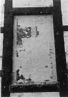 Als überraschend muß die Gestaltung der Ostfassade bezeichnet werden. Sowohl im Erd- als auch im Obergeschoß sind die drei nördlichen Fensteröffnungen seit jeher jeweils geschlossen. Zumindest in denen des unteren Geschosses hat sich unter einer späteren Übermalung die illusionistische Darstellung einer barocken, d.h. vierteiligen Fensteranlage erhalten (Abb. 3). Aufgrund der hier schwarz getönten Scheibenfelder und der weißen Fensterrahmen kommt man zu dem naheliegenden Schluß, daß an den übrigen Fensteranlagen des Gebäudes die Rahmen ebenfalls weiß waren. Auch die weitere Gestaltung der Anlagen läßt sich nachvollziehen, haben sich doch in der Hoffassade, d.h. im Treppenhaus drei originale vierteilige Fenster erhalten. Diese haben feststehende Bleiverglasungen, für die übrigen Fenster darf man jedoch jeweils vier Drehflügel vermuten, deren Äußeres anhand von Vergleichsbeispielen nachvollzogen werden kann.