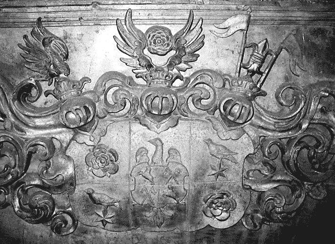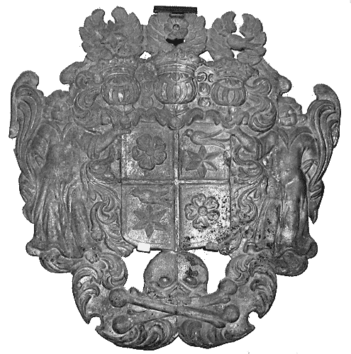 Die Wappentafel mit Schildträgerfiguren an den Seiten und einem Totenkopf stammt vom zerstörten Zinnsarg des Grafen Ludwig Ferdinand zur Lippe-Brake,