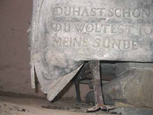 Schon durch den Transport hatte der Sarg einige Beulen und der Boden sogar ein großes Loch davongetragen. Insbesondere durch die unsachgemäße Aufstellung hat das Metall nun im Laufe der Jahre durch das Eigengewicht des Sarges so sehr nachgegeben, dass sowohl die Seitenwand als auch der Boden eingeknickt sind. Es ist zu befürchten, dass der Verfall weiter fortschreitet, falls nicht bald Maßnahmen zu Rettung des Sarges eingeleitet werden.