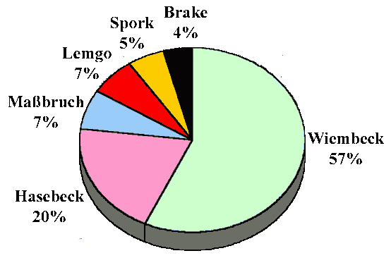 Deutlich ist zu erkennen, daß der weitaus größte Anteil der Abgaben mit mehr als der Hälfte aus Wiembeck kam. Es folgt Hasebeck mit einem Fünftel, während Maßbruch, Lemgo, Spork und Brake zusammen nicht einmal ein Viertel ausmachten.